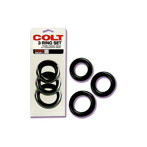 COLT Gear 3 Ring Set 3 pliable, heavy-duty rubber rings in 3 convenient sizes. 1.25 inches, 1.5 inches and 2 inches. Bulk weight 3.6 ounces. Safe and pure for body and pleasure. Made using phthalate free, non-toxic materials PVC. Cock rings when worn around the base of the penis and...