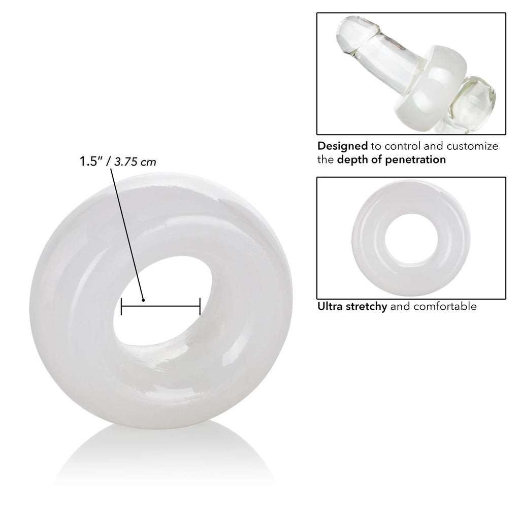 Stopper Ring Clear from Cal Exotics. The seamless Stopper Ring will transform uncomfortable penetration into a truly plush and comfortable experience. The flexible cock ring provides an ultra thick and durable cushion to help control and customize depth of penetration. Our 1.5 inch silicone ring fits snuggly on you to provide a soft, pillow-y cushion for your partner. The stretchy ring give you total control of penetration depth for ultimate in comfortable penetration. The ultra stretchy sleeve is made from a phthalate free, body safe Thermoplastic Rubber TPR to ensure peace of mind through every passionate moment. This durable ring is easy to use, easy to clean and requires no special care. Prior to and after each use, wash ring internally and externally with warm water and soap, then disinfect with the Universal Toy Cleaner.