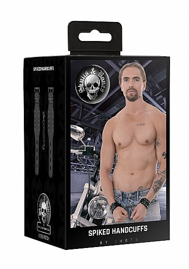 Ouch! Skulls and Bones Handcuffs with Spikes Black from Shots Toys. With two rows of impressive spikes, a double clasp on each handcuff and a sturdy, detachable, metal connection, this bracelet shows you mean business. Made of high quality black Bonded Leather and dark gray metal, these Skull Handcuffs always come in handy!