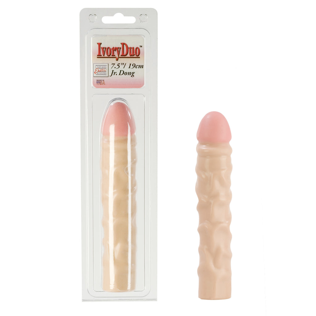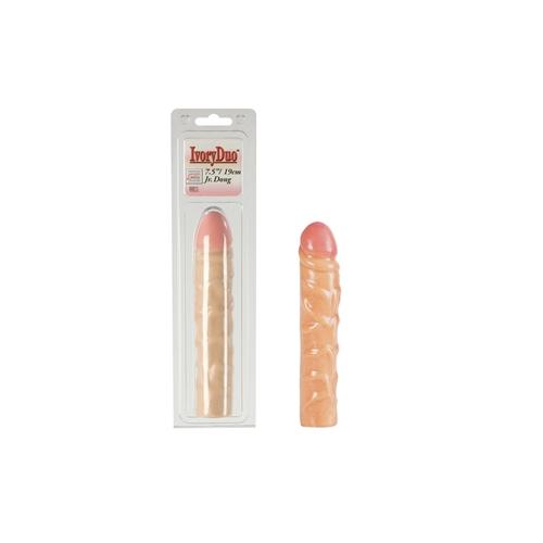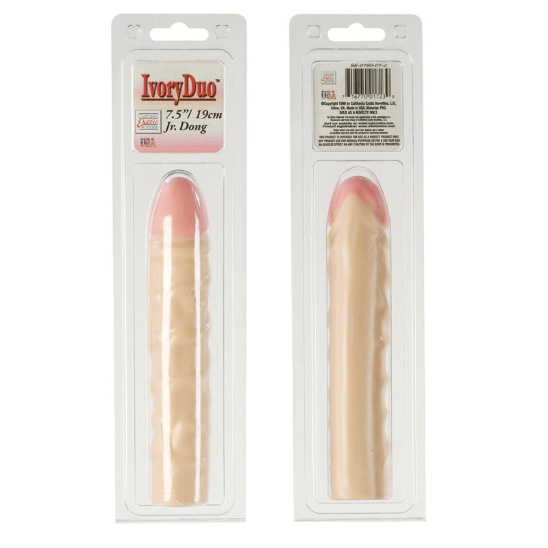 Ivory Duo 7.5" Jr. Dong. Life-Like Dongs are soft, pliable, and highly detailed! Superior quality all-purpose dongs in a variety of shapes and sizes. Hand finished and detailed ivory rubber dong with a thick-veined texture. High quality, phthalate free, non-toxic materials Anti-bacterial Poly-Melt PVC. Large size dong measures 7.5 inches...