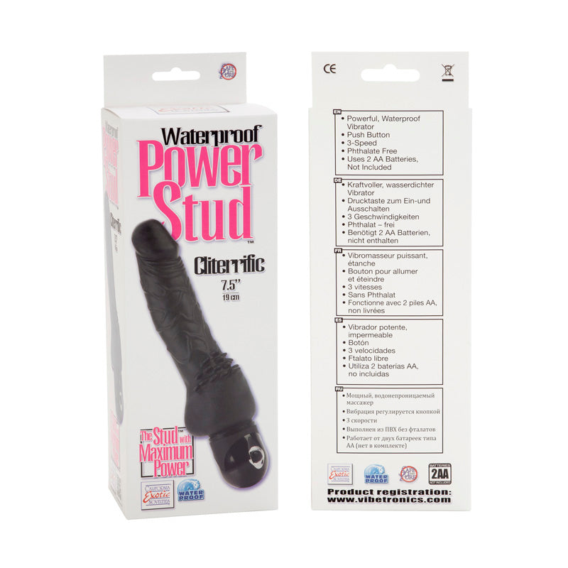 Waterproof Power Stud Cliterrific Dong Black Vibrator. Power Stud Vibrator is a traditional design with a contemporary flair. Body safe, push button 3 speed controller, 100% waterproof. Soft and flexible vibrators feature clitoral stimulating nubs at the base of the shaft. 3 speeds. Power packed. Easy to operate. Push button...