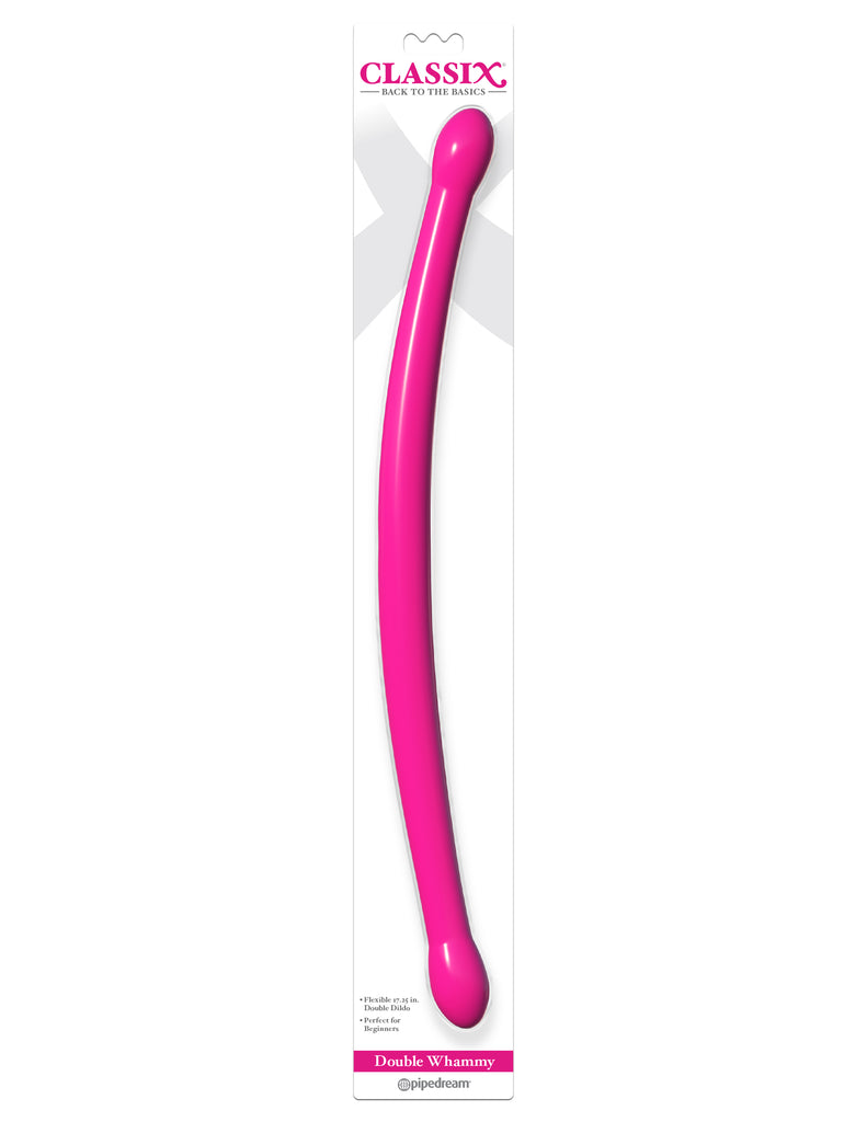 Classix Double Whammy Pink Dual Dildo from Pipedreams. Double the pleasure, double the fun! This firm yet soft double ended dildo is perfect to enjoy with a partner or as a double penetrator. The super flexible dildo is easy to clean and use again for your next fulfilling adventure! Flexible enough to bend and shape to hit your favorite spots! Size 17.25 inches in length by 1.25 inches in width.