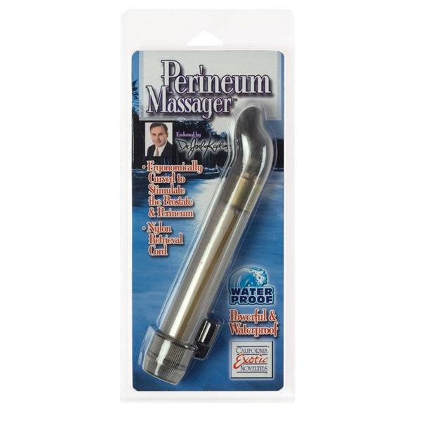 Dr. Joel Kaplan Perineum Massager is available in two lengths: 4.5 inches and 6.5 inches. Each sold separately. Intimately curved to stimulate the male g-spot, prostate and perineum. Powerful waterproof vibrations for play outside the bedroom. Multiple speeds for multiple, intense orgasms. Small size personal massager comes with a handy nylon retrieval cord. Waterproof sex toys are safe for use in the bath or shower. Do not submerge for long periods of time and take care to thoroughly dry after each use. Safe and pure for body and pleasure. Made using phthalate free, non-toxic materials ABS plastic. All types of lubricants may be used with hard plastics. Vibrating sex toy requires 2 AAA batteries, not included. Do not leave batteries in the vibrator between uses. Dr. Joel Kaplan Perineum Massager 6.5 inches is a registered trademark for California Exotic Novelties.