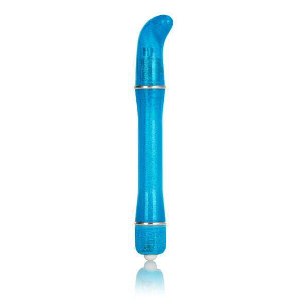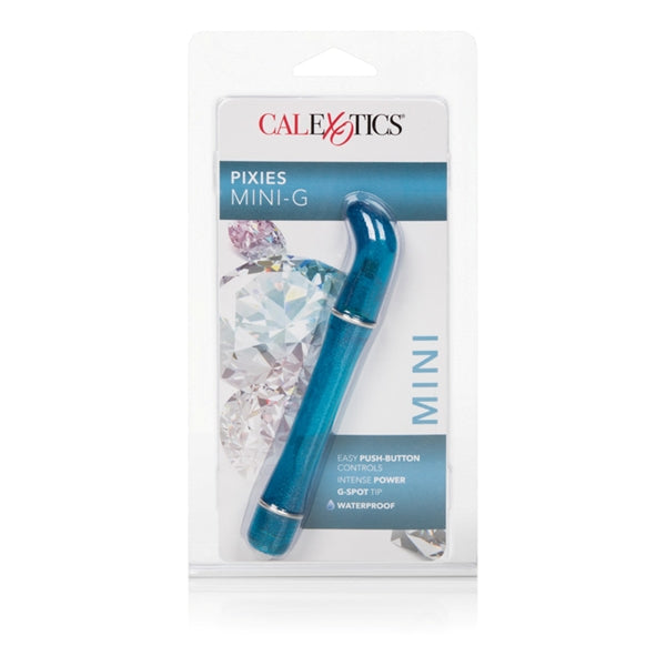 Waterproof Pixies Mini G Blue Vibrator. Power packed petite waterproof vibrating massager with curve to zone in on the G-spot pleasure zone. Made with durable and easy to clean plastic, this massager has a sparkling shimmer while the contoured shape supplies total stimulation. The wand-like design makes it easy to control and grip. A single push-button activation directs the vibrations and the waterproof construction makes it fun in the shower or bath. Total length is 5.75 inches with an insertable length of 5 inches. Vibrator measures 5 inches long by .75 inch wide. Bulk weight 0.90 ounce. Vibrating sex toy requires 2 AAA batteries not included. Do not leave batteries in the vibrator between uses. A water based lubricant is recommended. Always clean before and after use. Category: For Women, Vibrator, Vibrators. Pixies Vibes hold the US Patent # D450952. Waterproof Pixies Mini G Vibe is a registered trademark for California Exotic Novelties. Sex toys and sexual wellness.