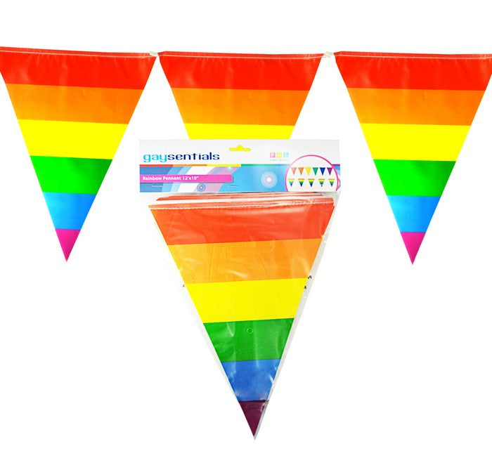 Gaysentials Pride Goods Rainbow Striped Pennants. Show your colors with these pennants. Decoration for inside or outside. Our 12 feet long Striped Rainbow Pendant string is the perfect way to show the world your pride. Attract attention, get noticed draw the Rainbow Customer to your establishment or party. There are...