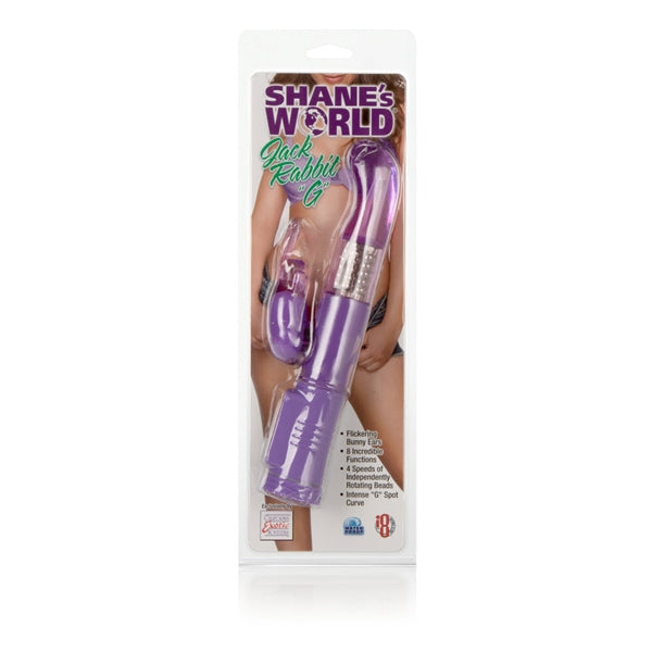 Shane's World line from California Exotic Novelties Jack Rabbit G Vibrator Purple. World famous Jack Rabbit with an accentuated G-spot curve. Sized for beginner, intermediate, and advanced users. 8 intense functions of vibration, pulsation and escalation. 4 speeds of independent shaft rotation. 5 rows of non-jamming, rotating beads.Easy to use...