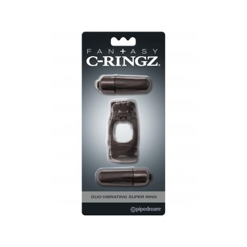 Fantasy C-Ringz Duo Vibrating Super Ring Black provides erection support, amazing vibrations, and explosive orgasms! Prolong the fun and make pleasure last with this beginner friendly Duo Vibrating Super Ring! This fun teaser will produce explosive results and is the perfect add on to any spontaneous encounter! Two powerful bullet vibrators provide amazing vibrations for your partner, while the super stretchy ring helps maintain thicker, harder erections. Try the ring in the shower and turn bath time into play time! With a vibrating bullet on the top and bottom of the ring, both partners will be amazed by the incredible sensations! This incredible ring is ready to go right out of the package! Each vibrating bullet is powered by three AG13/LR44 batteries, included. To power the bullets on for the first time, remove the paper liners and make sure the caps are screwed on tightly. Made using body safe materials Thermoplastic Rubber TPR Ring, ABS plastic Bullet Vibrators.
