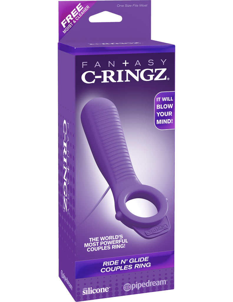 Fantasy C-Ringz Ride N Glide Couples Ring Purple. Grind your way to ecstasy on the incredible Ride N Glide Couples Ring! Powered by our strongest vibrating bullet and covered in silky smooth silicone, the Ride N Glide will blow your mind! The textured vibrating stimulator delivers amazing pulsations directly to...