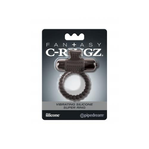 Fantasy C-Ringz Vibrating Silicone Super Ring Black provides erection support, amazing vibrations, and explosive orgasms! Prolong the fun and make pleasure last with this beginner friendly Vibrating Silicone Super Ring! This fun teaser will produce explosive results and is the perfect add on to any spontaneous encounter! The powerful bullet provides amazing vibrations for your partner, while the super stretchy silicone ring helps to maintain thicker, harder erections. Tiny love nodules on the extended tongue will excite your partner with direct, intense clitoral stimulation! Try the ring in the shower and turn bath time into play time! Wear it around the base of your shaft or around the entire package for maximum comfort and ultimate constriction. This incredible ring is ready to go right out of the package! The vibrating bullet is powered by three AG13/LR44 batteries, included. To power the bullet on for the first time, remove the paper liner and make sure the cap is screwed on tightly. Made using body safe materials Silicone ring, ABS plastic Bullet Vibrator.