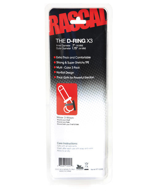 Rascal The D Ring 3 Pack Cock Rings. Multi-color 3 pack. Extra thick for comfort. Made from strong and super stretchy Thermoplastic Elastomers TPE. No roll design. Inner diameter 0.7 inch. Outer diameter 1.75 inches.