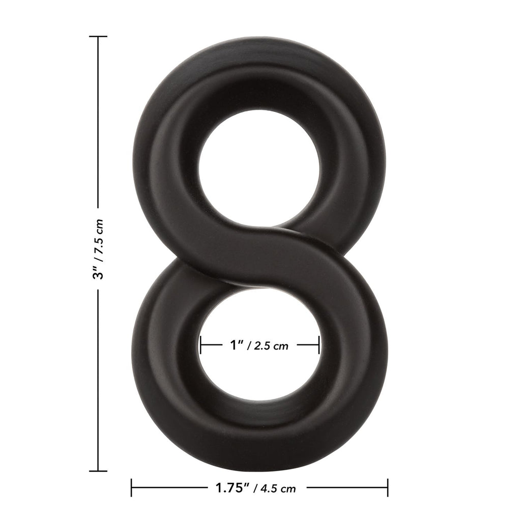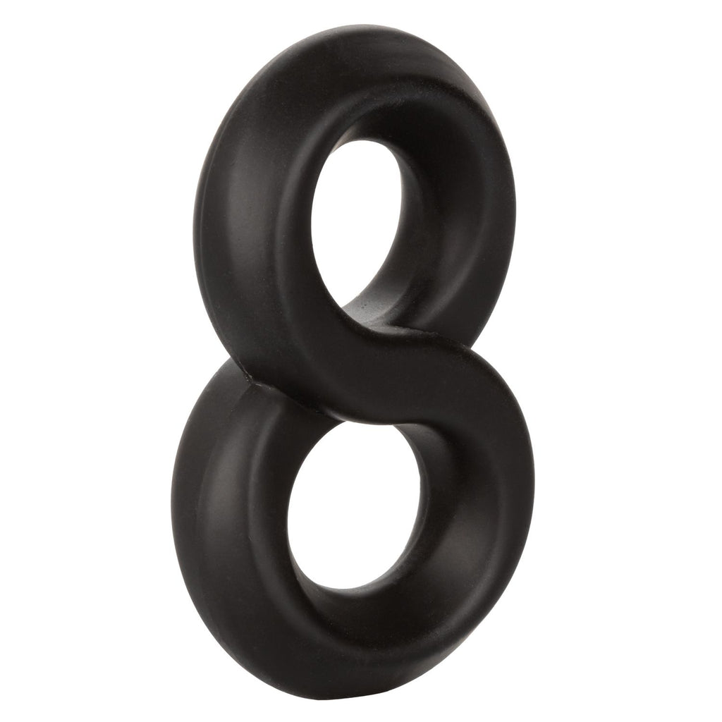 Ultra Soft Crazy 8 Cock Ring Black from California Exotic Novelties. From bashful beginners to erotic experts, the Ultra Soft Crazy 8 will wrap you tight in pleasure with the ultra plush, stretchy dual enhancer ring. The stretchy, comfortable enhancer was created to increase stamina, improve sensitivity and deliver superior erection support. Look forward to an explosive pleasure experience while the unique built in scrotum support holds tight. The premium Ultra Soft silicone is body safe, unscented and phthalate free to keep you most sensitive spots, happy and healthy.