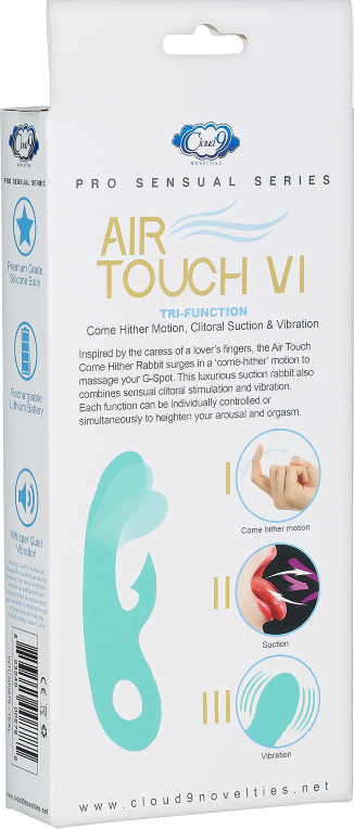 Pro Sensual Air Touch VI G Spot Come Hither Motion Rabbit Dual Function Clitoral Suction Teal from Cloud 9 Novelties. Inspired by the caress of a lover’s fingers, the Air Touch Come Hither Rabbit surges in a ‘come-hither’ motion to massage your G-Spot. This luxurious suction rabbit also combines sensual...
