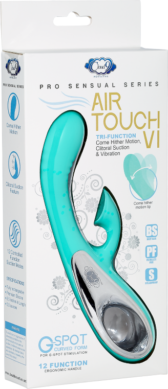 Pro Sensual Air Touch VI G Spot Come Hither Motion Rabbit Dual Function Clitoral Suction Teal from Cloud 9 Novelties. Inspired by the caress of a lover’s fingers, the Air Touch Come Hither Rabbit surges in a ‘come-hither’ motion to massage your G-Spot. This luxurious suction rabbit also combines sensual clitoral suction stimulation and 12 levels of vibration. Each function can be individually controlled or used simultaneously to heighten your arousal and orgasm. This Cloud 9 Pro Sensual series has three distinct functions including Come Hither Motion, Clitoral stimulation and vibration in one device. This device includes an ergonomically curved form designed for exact G-Spot Stimulation. Ergonomic handle is easy to hold in place during use with your fingers as the device is inserted towards your body.