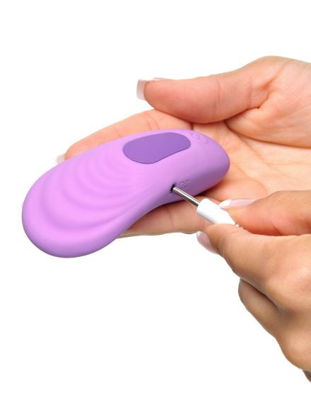 Fantasy For Her Please Her Remote Control Purple Silicone Vibrator. She was ready for sexual freedom, the freedom to use her Remote Silicone Please Her whenever and wherever she wished. The tiny size hugged her mound and the smooth silicone of the petite vibe felt good against her skin and warmed to her own body temperature. She used the remote to turn on the quiet vibration and held her Silicone Please Her firmly against her swelling clitoris. Her body glistened with moisture as she let the pulsing pleasure guide her towards orgasm. Her mouth opened into a perfect O as her climax rocked her body with sensual waves. She smiled knowing her personal happiness was wonderfully complete. Details charging instructions Rechargeable via the included USB cord. Can be used with or without the remote. Press and hold the power button on the Please Her to initiate power. Press the power button to cycle through 9 patterns of vibration. Press and hold to turn off. Remote instructions: to use remote, turn on the Please Her first, then turn on the remote to sync. Press the power button on the remote to cycle vibration patterns. Note: remember to turn off both the remote and Please Her. Great for couple's play! Discreetly wear in panties for date night. Slim and contoured, perfect during sex. Intense, whisper quiet vibes for solo play. Wireless remote control. 9 intense vibration patterns. Size 3.5 inches by 1.6 inches.