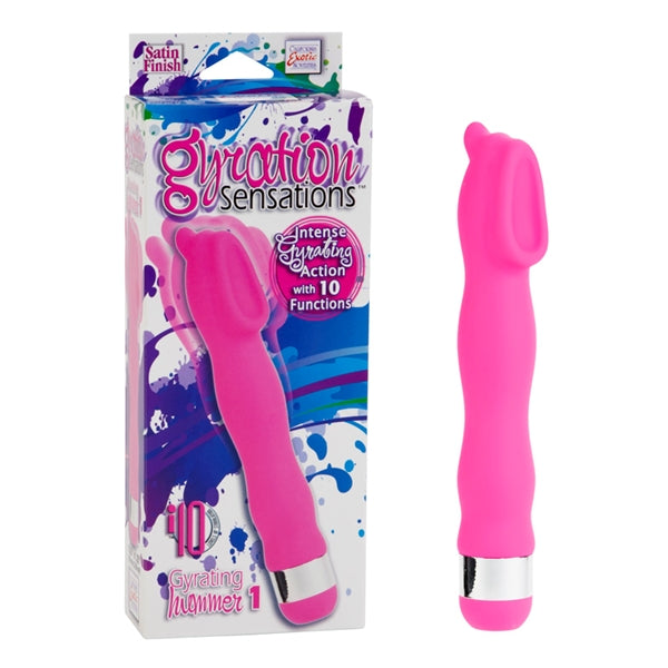 Gyration Sensations Gyrating Hummer Pink Vibrator. Extreme vibrating and throbbing massager with famous scoop design and love nub. 10 powerful functions of vibration, pulsation, and escalation. Easy to operate. Push button control. Hold button for 4 seconds to turn off. Memory chip resumes on last function used. Silky smooth Satin...