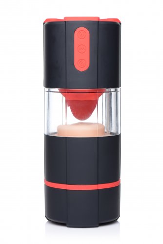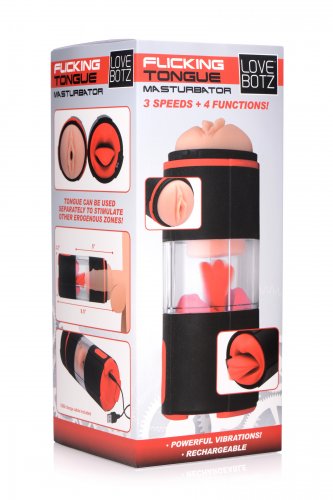 Lovebotz Flickering Tongue Masturbator from XR Brands. This vibrating masturbation stroker goes beyond fantasy, allowing you to penetrate a vagina and feel a tongue within! Treat your penis to 3 speeds and 4 functions of vibration from the vulva and flickering from the tongue. Just lube up and slip right in! You can even detach the tongue portion to use it separately on other parts of the body. The vulva is made of a soft material that feels ultra realistic, with texture details within. The silicone tongue is firm but flexible. Experience vaginal and oral sex at the same time with this innovative male masturbator! Use with only water based lubricants and clean with mild soap or toy cleaner to preserve the materials. A cap is included for easy storage. Measurements: 8.5 inches in total length, 5.5 inches insertable length, 3.2 inches in diameter, 2 inches maximum internal diameter. Materials Silicone, ABS Plastic and Thermoplastic Rubber TPR. Color Red, Beige. Note charges via USB cord.