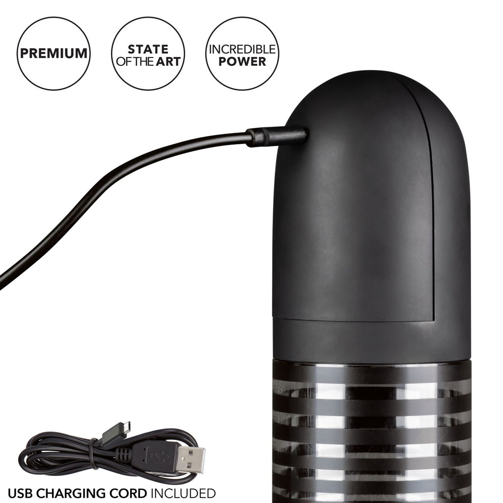 Specifications: Color Black. Materials Silicone, ABS Plastic, Polystyrene. Power source USB Rechargeable, included.