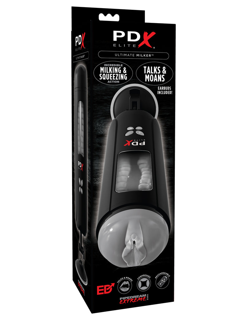 PDX Elite Ultimate Milker introducing first of its kind milker masturbation technology designed to fully surround your shaft with squeezing, gyrators stimulation for the ultimate self pleasure experience! A transparent window allows you to view the action as every inch of your cock is milked over and over by 10 revolving, gyrating functions, plus 5 active speed levels, all powered by a convenient rechargeable motor. The internal multi-ribbed Thermoplastic Elastomers TPE sleeve is lined with incredibly satisfying textures to enhance rotational pleasure and features a closed end to further intensify natural suction. To enjoy fully automated rotational masturbation, simply press the button to initiate active milking power. Sexy, breathy moans can also be activated for intensified erotic excitement! Powered by USB Rechargeable via the included USB cord. The sleeve is removable for easy cleaning. Length 10.5 inches, width 3.25 inches, inner diameter 2.75 inches.