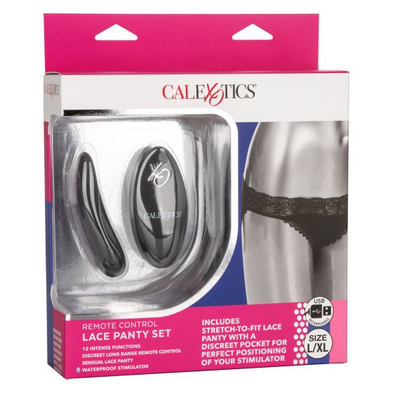 Remote Control Lace Panty Set L/XL from California Exotic Novelties. Indulge in your newest dirty little secret with the Remote Control Panty Set. This sexy set includes a stretch to fit cheeky panty, curved panty teaser and a discreet remote control with a range of up to 32 feet. Whenever or wherever passion takes you, this passionate mini vibrator’s 12 intense functions of vibration are ready for playtime. The sexy and stretchy lace panties feature a discreet internal pocket for the perfect stimulator pocket. Machine washable and oh so comfortable, these vibrating panties are made from extended wear and adventurous playtime. Whether you choose to stay in control or you have left pleasure in your partner’s hand, this powerful teaser is sure to deliver knee shaking sensation. From blushing beginners to erotic experts, this playful set adds versatile vibrations to any toy box. Recharge your passion in only 1 hour with the provided USB cable for up to 45 minutes of low speed vibration or 40 minutes of high intensity stimulation.