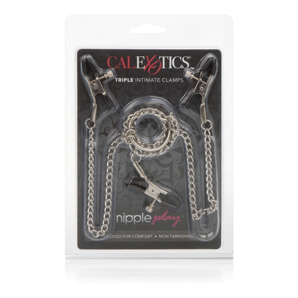 Nipple Play Triple Intimate Clamps includes 3 fully adjustable multi-use clamps. Soft, comfortable pads. Sturdy high quality dual chain for added sensuality. Non-tarnishing, nickel free. Safe and pure for body and pleasure made using phthalate free materials. Nickel free Iron chains, clamps, PVC pads. 2.25 inches by 1 inch each clamp. 26.5 inches overall length. Bulk weight 2.5 ounces.
