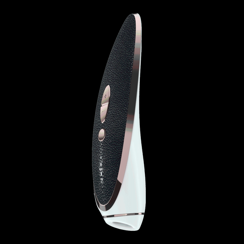 Satisfyer Luxury Haute Couture Clitoral Vibrator. In supple and elegant fashion, the ring of ultra soft, medical grade liquid silicone surrounds your pleasure bead and caresses it with the usual breath taking Satisfyer pressure wave stimulation. Its intuitive controls let you choose your favorites from 11 different intensity settings and enjoy the heavenly feeling of non-contact clitoral stimulation. The ergonomic shape of the Satisfyer Luxury Haute Couture sits comfortably in your hand, while the refined upper in sensuously structured leather will make you feel like a queen. The gold colored elements made of precious metal and the silky, matte body in smart white complete the luxurious design perfectly.